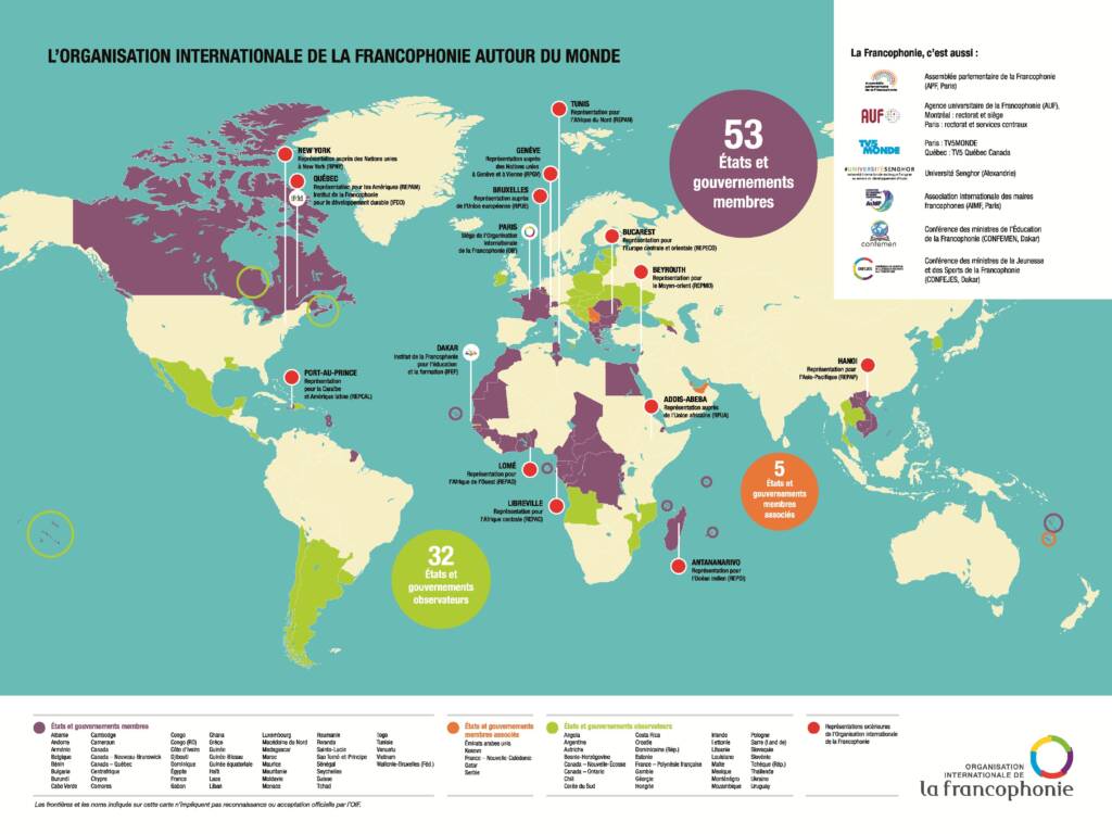 La Francophonie (avec un grand F ;o) est institutionnelle, elle s’incarne dans l’Organisation internationale de la Francophonie (OIF : https://www.francophonie.org).